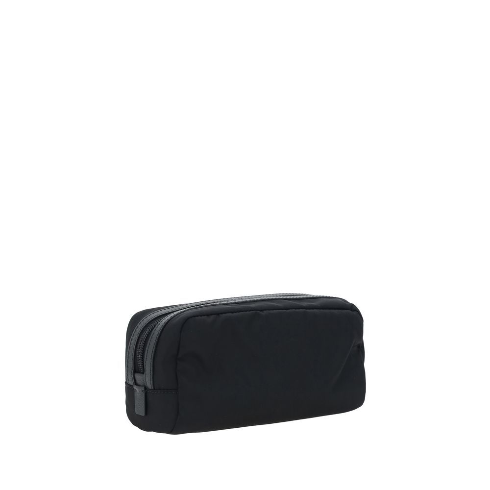 Re-Nylon Beauty Case by Prada, top zipper closure, triangular logo plaque applied to front, leather details.